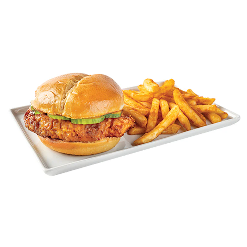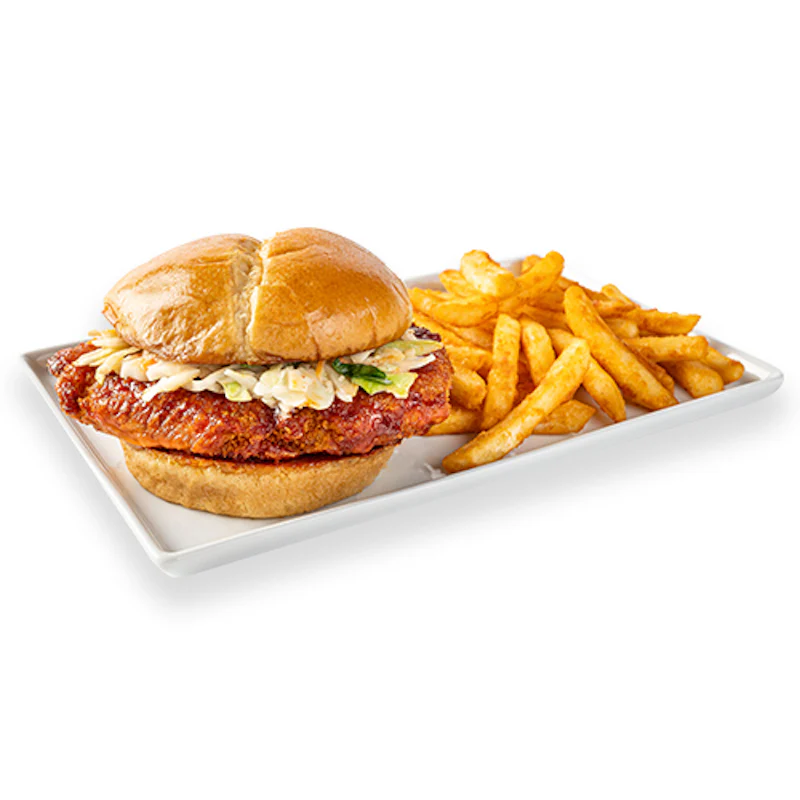 Fried chicken breast brushed with a choice of signature flavor, topped with Korean Cucumber Salad*, Kewpie mayo on a brioche bun. Served with fries. (*Contains sesame seeds and/or sesame seed oil.)