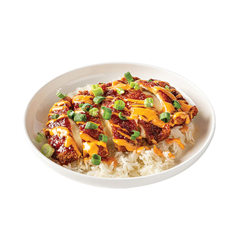 Breaded chicken breast served drizzled with katsu sauce and spicy mayo topped with scallions. On steamed rice with a side of coleslaw. (*Contains sesame seeds or sesame seed oil.)