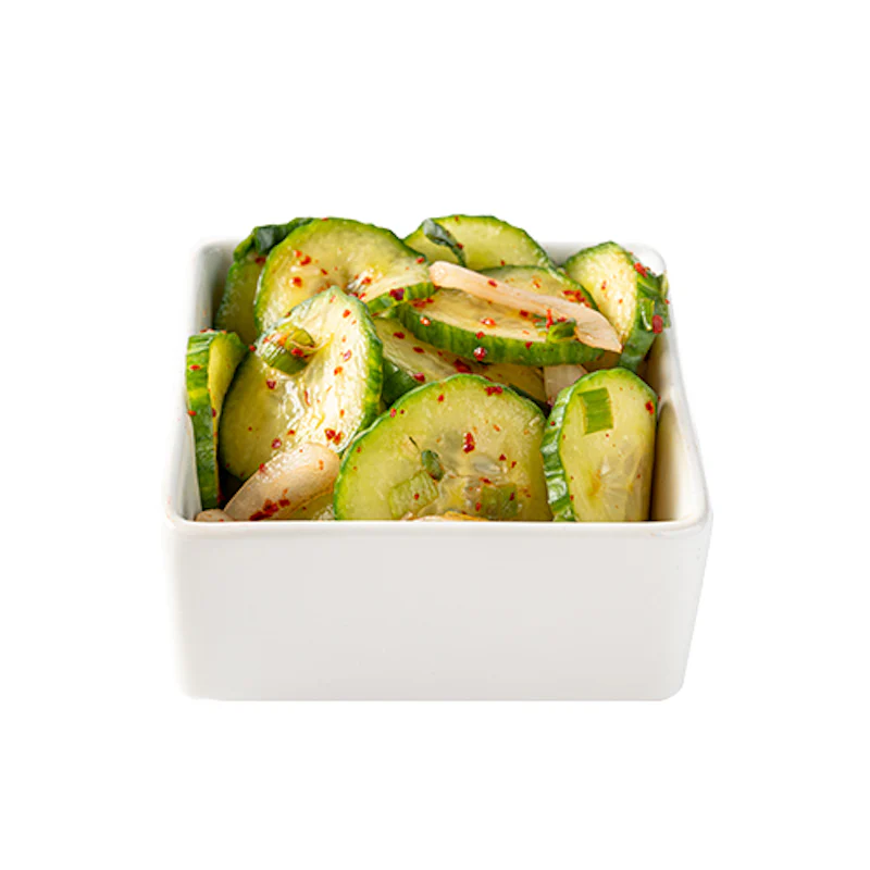 Sliced cucumbers, onions, scallions, and Korean red chili powder.
