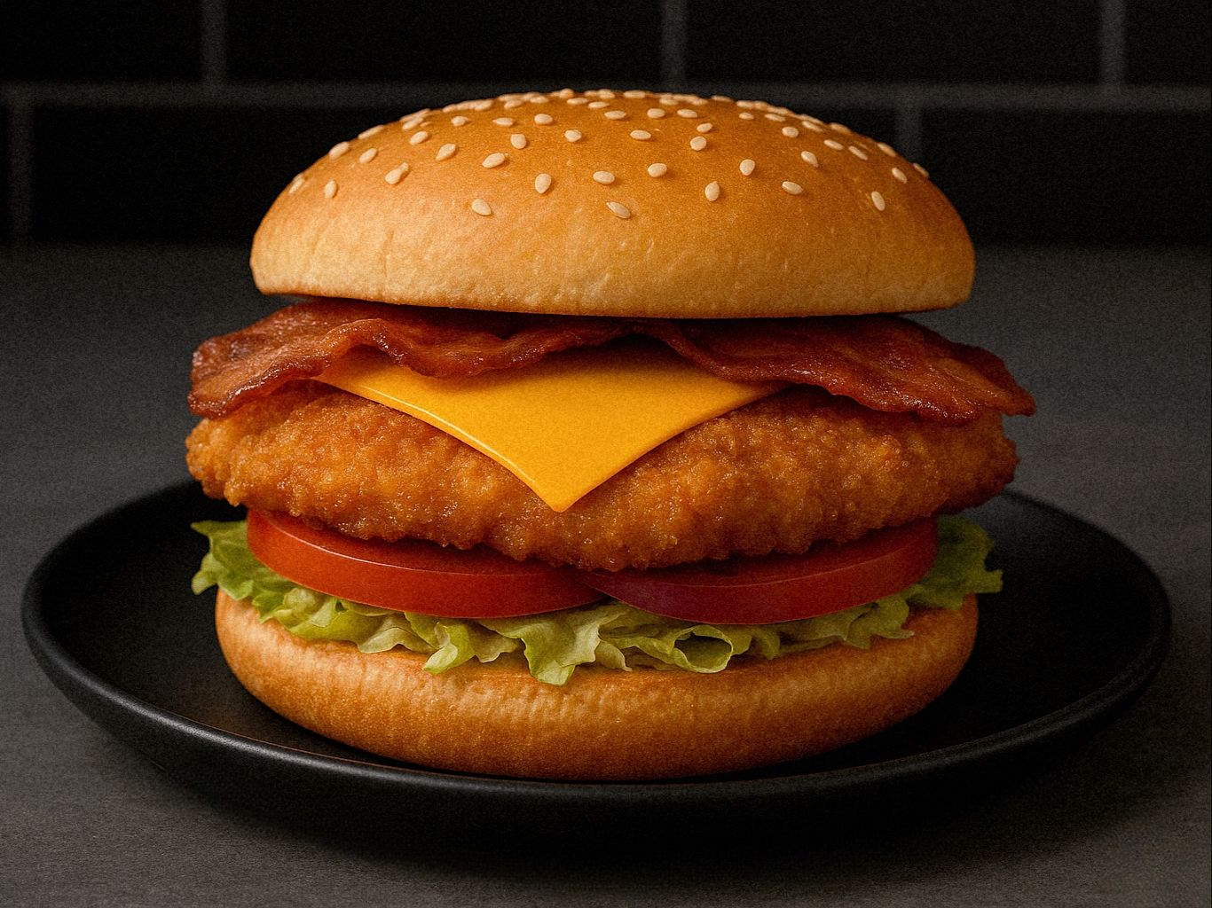 A spicy chicken patty served on a soft Brioche bun with fresh lettuce, tomato, and creamy mayo.