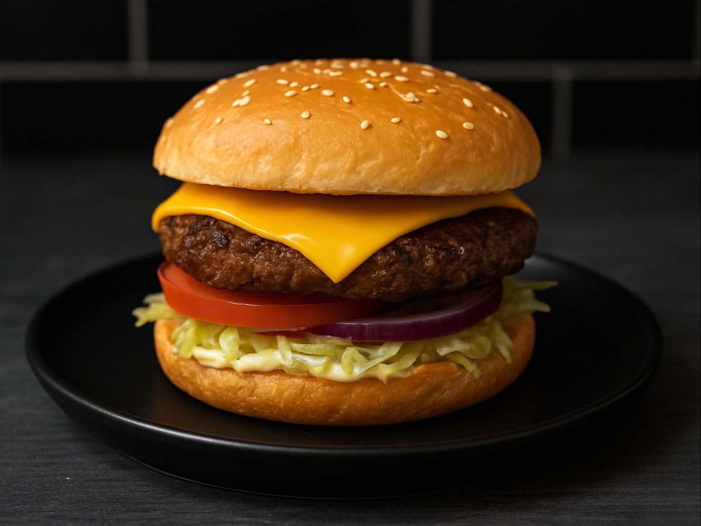 A juicy beef patty served on a soft Brioche bun with mayo, ketchup, mustard, fresh lettuce, tomato, onions, and pickles.