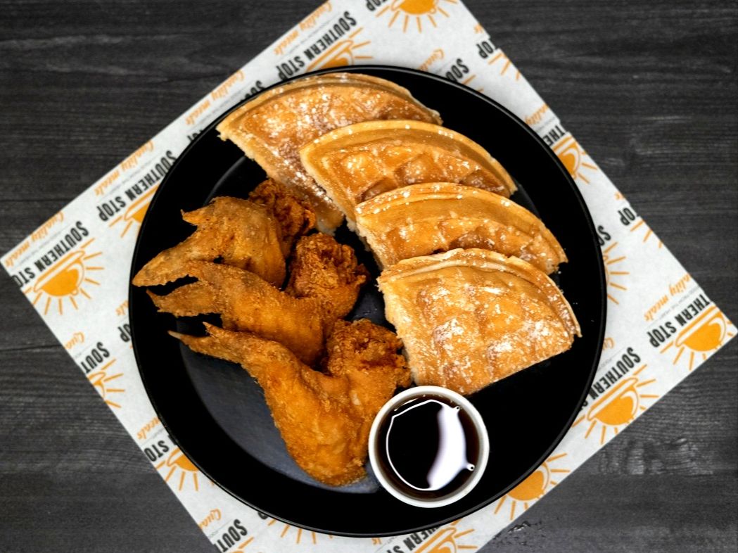 3 Fried Whole Chicken Wings with a delicious Belgian Waffle.