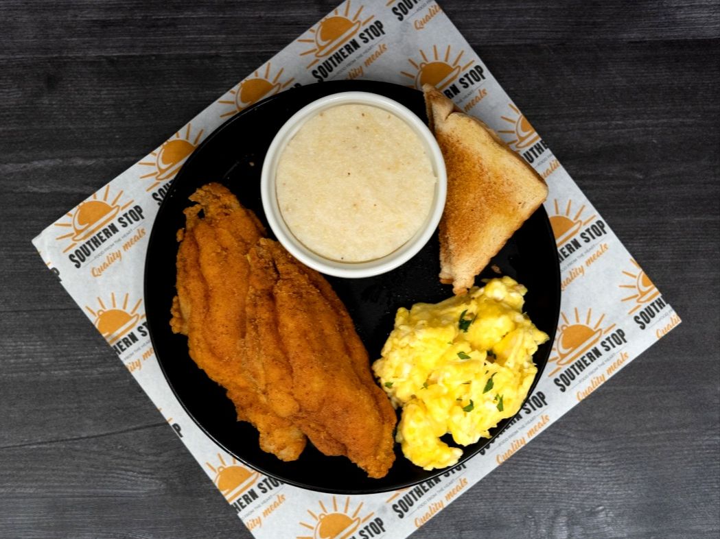 Grits, 2 Eggs, 2 Catfish Fillets and Toast.