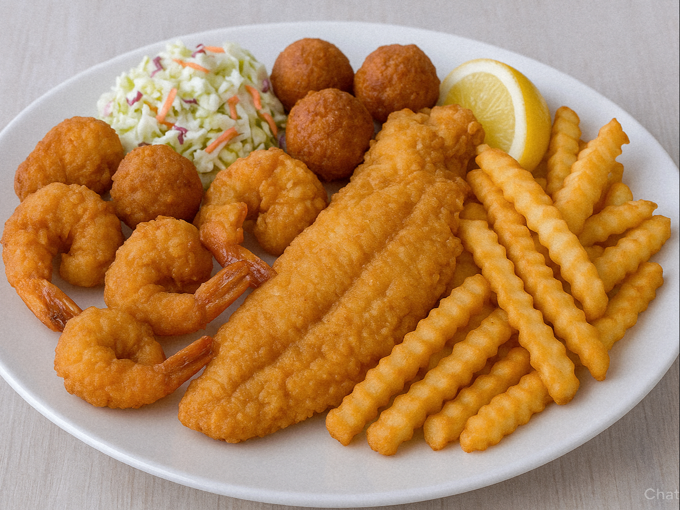 Fresh Catfish Fillets, Hushpuppies, a side choice (Coleslaw or Grits), and Butterfly Shrimp. Served with our signature seasoned fries.
