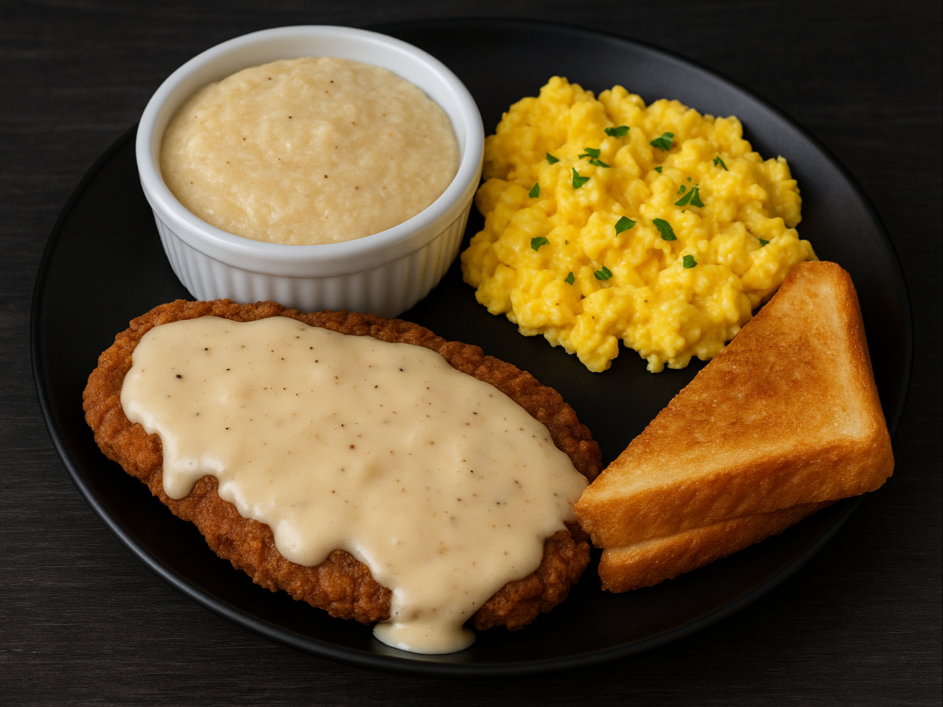 Grits or Hash brows. 2 Eggs, Country Fried Steak & Grave and Toast.