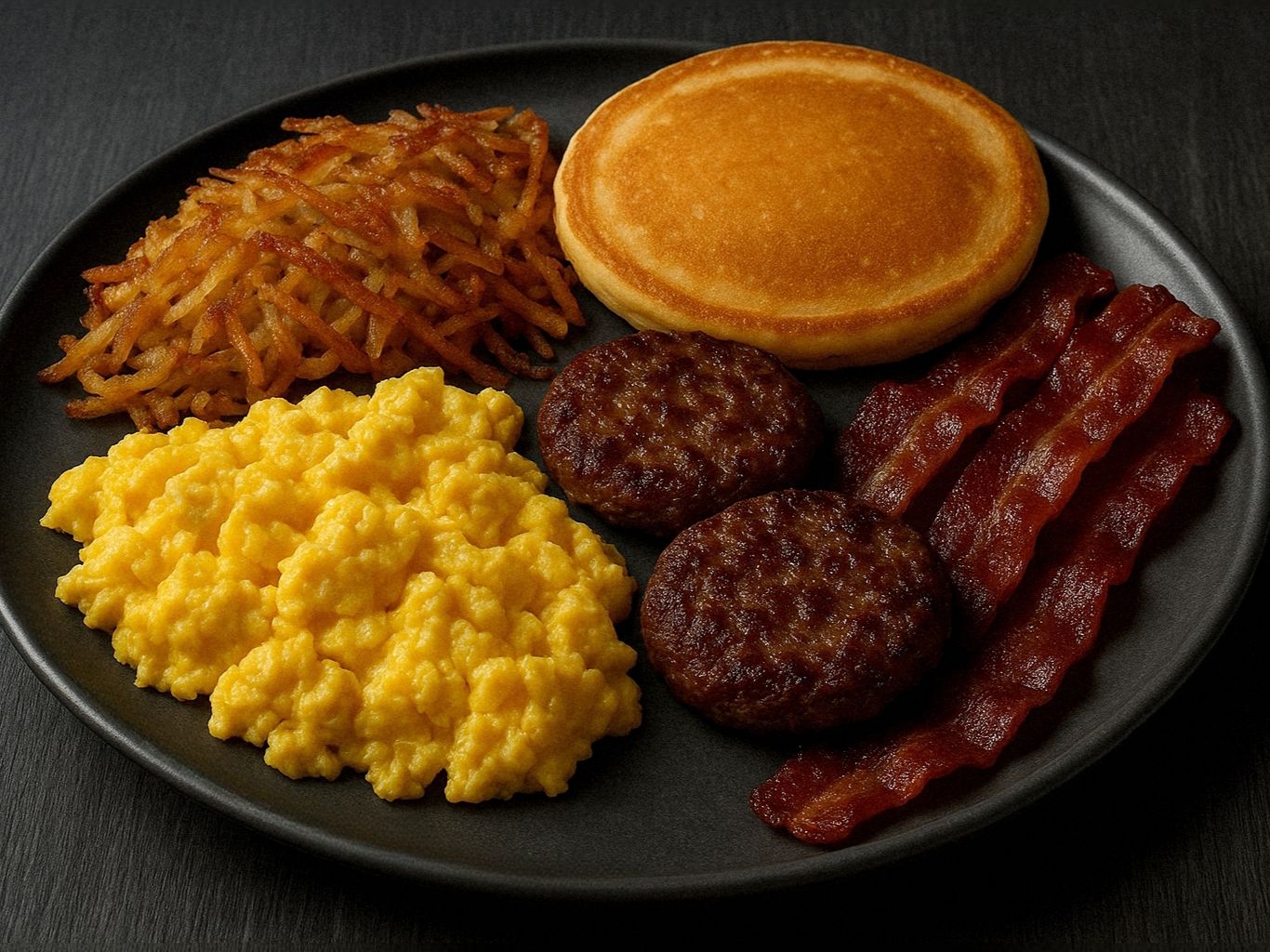 Grits or Hash browns, 3 Eggs, and 2 Meat Selection (Sausage Patties or Sausage Link or Bacon), 1 Pancake and 1 Toast.