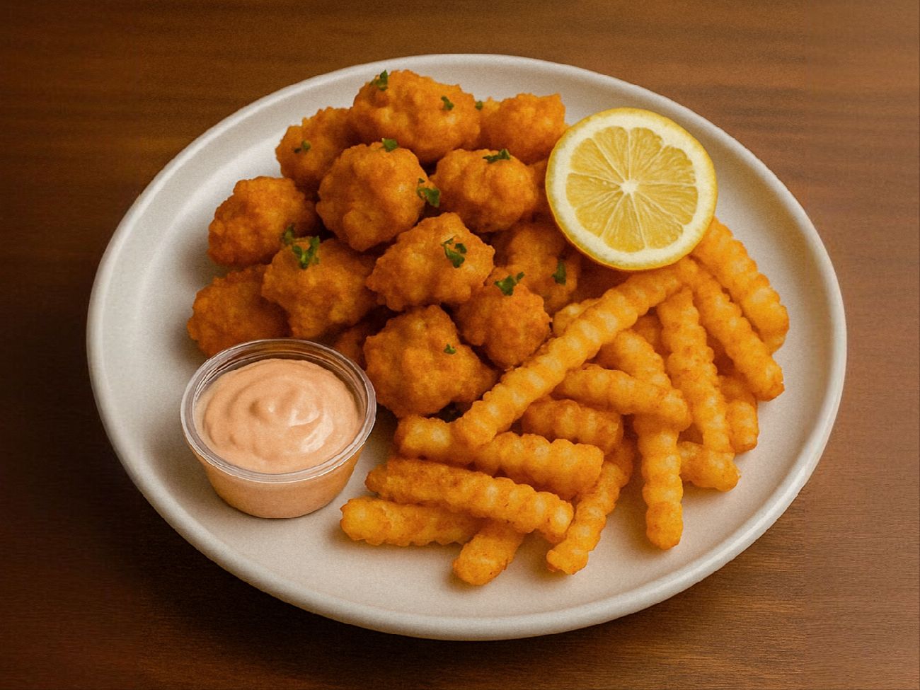 Butterfly Shrimp fried to a golden crisp. Served with our signature seasoned fries.